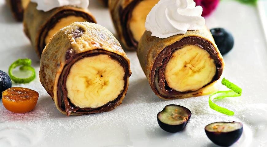 - Очистите банан и разрежьте вдоль на четвертинки. Положите банан на край блинчика и скрутите трубочку. Повторите с оставшимися блинчиками.