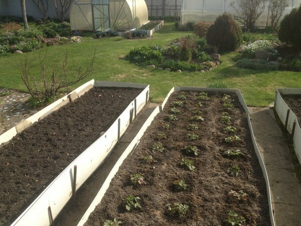 И грядка с капустой возле новой теплицы тоже сделана в недавно из широких панелей (часть панели закопана в земле: