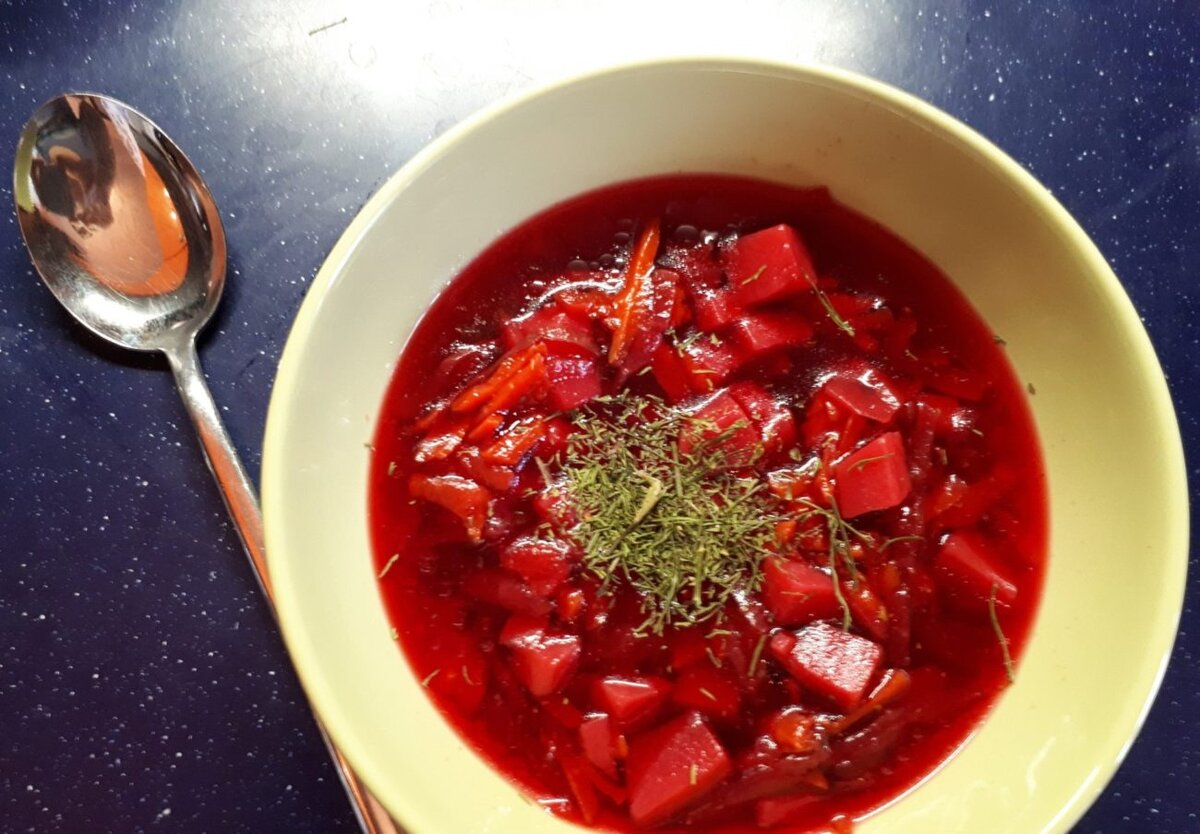 Теперь в эту же сковороду нальем немного масла и нагреем его. Кладем натертую свеклу. Сразу же необходимо добавить какую-нибудь кислоту. У меня яблочный уксус. Обжариваем на сильном огне минуты 3. Затем добавляем свеклу в кастрюлю. И сразу же сюда нальем еще пару ложек уксуса. Все хорошенько перемешаем. Выключаем огонь и даем настояться. Добавим зелень и можно разливать по порциям.
