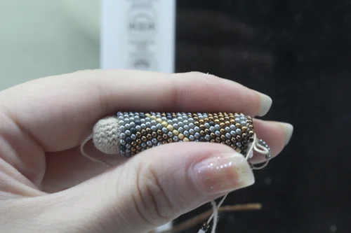 Дальше вяжем рядов 4-5 без бисера, так чтоб было удобно держаться и вязать дальше с бисером более плотно, и кроме того этот кусочек запрячется в колпачок.
