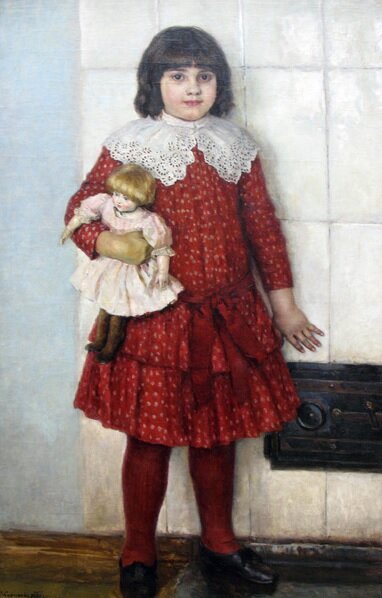 Девочка с доверчивостью взирает на художника, крепко прижимая правой рукой куклу к себе. Зовут малышку Оля и она является дочерью художника Сурикова. Художник создавал портрет дочери в непростой для себя момент. Дочь давала ему возможность хоть немного отвлечься от отхвативших его страданий.