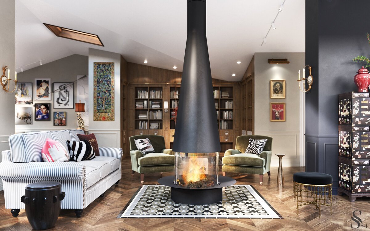Для этой гостиной был спроектирован уникальный камин, расположенный в центре гостиной зоны. Основной задачей каминов было обеспечение тепла, но со временем они превратились в настоящее произведение печного искусства. Роль отопительного прибора отошла на второй план, и камин стал украшением дома, создавая особую атмосферу уюта.