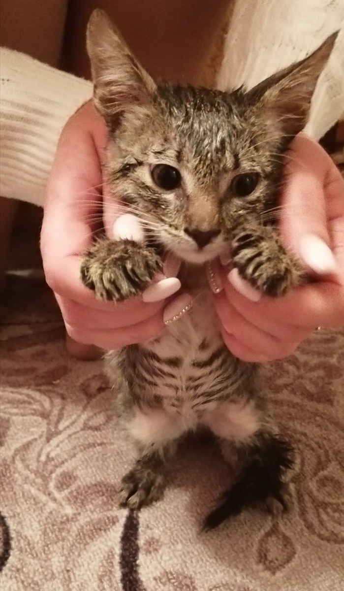 В прошлом году мы с мамой приехали навестить папу,привезли молока,яиц,сметану. Он живёт один,поэтому был рад нашему приезду. Мы попили чай, поговорили,и решили сходить в магазин. Купили продукты,идем домой. Только мы подошли к дому,как вдруг с 3го падает котёнок, он ударяется об крышу подъезда,и падает об землю с визгом.Люди которые его выкинули, закрыли окно и завесили шторкой. Сразу же выбегает дворовый кот,и бежит за ним. Мы стали его ловить,минут 15 искали,и понесли домой. Он визжал от боли,было очень жалко. Фото выше,это состояние как только мы его принесли.Мы его помыли,покормили,погрели и повезли в деревню
