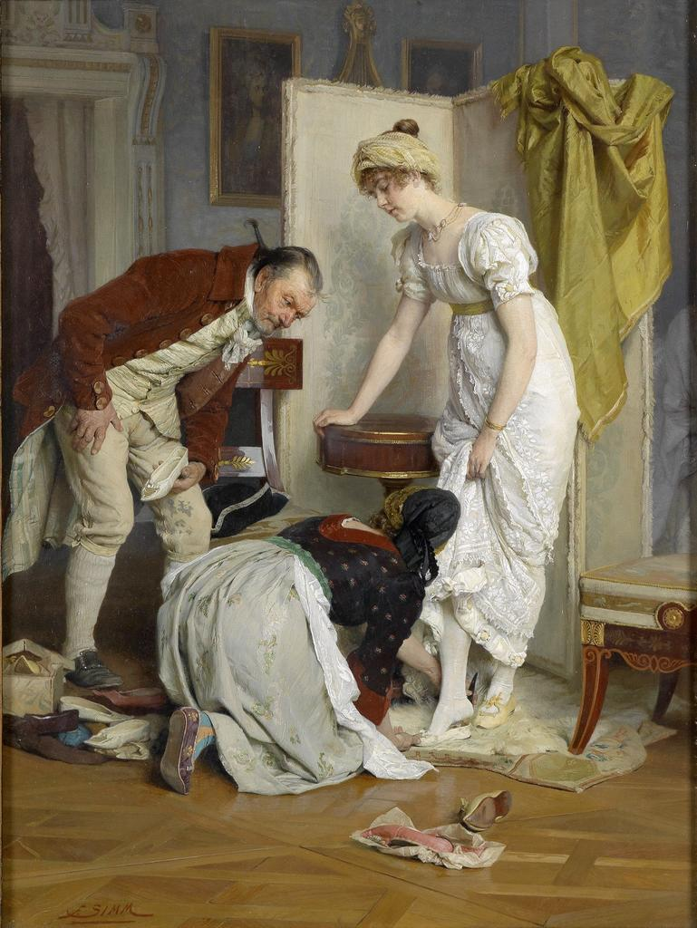Это типичная ситуация для рубежа XVIII и XIX веков, что старшие поколения одеваются по моде предшествующих десятилетий. Сложно понять, кто этот дедок. Это может быть продавец обуви (но тогда ему следовало быть одетым по моде и в новую одежду, раз уж он вхож в богатые дома). Может быть слуга, который помогает госпоже одеваться. Наконец, это может быть отец барышни. Тогда дела семьи не так хороши, как можно подумать по ее наряду и обстановке дома. Возможно, последние деньги пущены на обновки для нее, чтобы на ближайшем балу она нашла себе хорошую партию, и поэтому пожилой отец лично курирует подбор недешевой обуви.