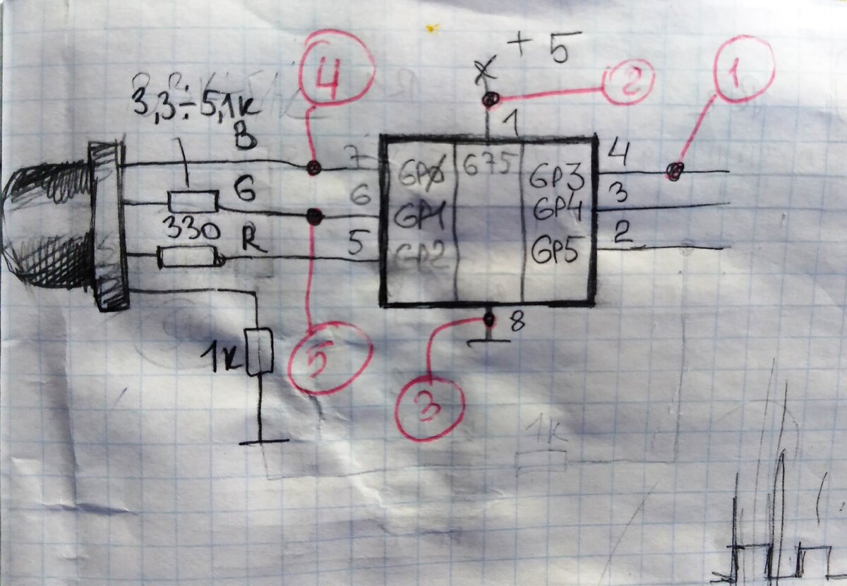 В свободные от работы в нынешние посленовогоднишние выходные, по старой доброй памяти слепил таки микрогирлянду для настольной елочки. Суть - в каждой лампочке свой микропроцессор, пусть она живет и светится по случайному закону в гирлянде. Это нынче недорого. PIC12F675 стоит 35 рублей (от 32 до 48 руб на Али), RGB светодиод обойдется не дороже 5-ти рублей, резисторы, провода, мелкую моторику дрожащих с похмелья пальцев, и выходные праздничные дни можно в учет не принимать. В общем, получилась конструкция выходного дня из имеющихся в наличии комплектующих.