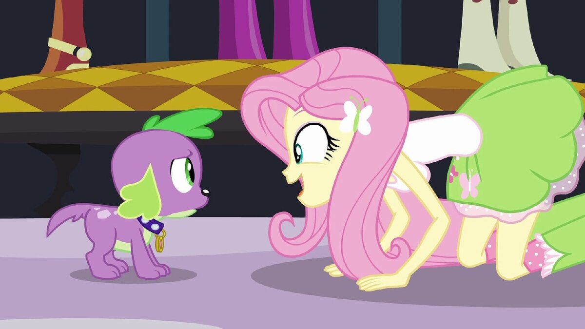 Не отходя далеко от кассы, стоит упомянуть и реакцию Рарити-2 на то, что Спайк умеет разговаривать. В Эквестрии Рарити этому не особо была удивлена, а в мире людей она просто выпала от такого открытия.