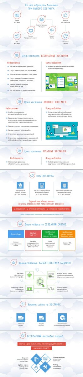 Если Вы перед выбором хостинга просмотрите нашу инфографику, ошибки в этом деле Вам не грозят. Выбрать хороший хостинг сможет любой пользователь. После проверки у Вас останется максимум два-три варианта, на которых можно спокойно заказывать тестовый срок. Не бойтесь проверять сразу два варианта, так будет даже лучше, появится возможность наглядного сравнения!