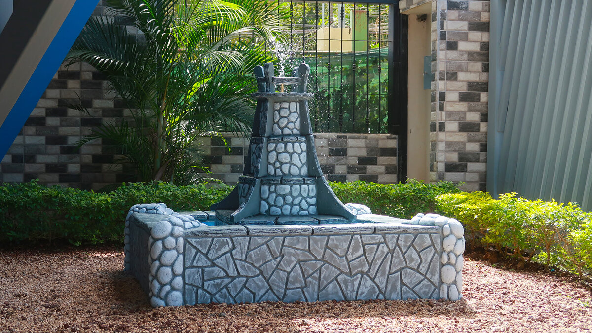 The fountain can be of any size. We chose the size of the main pool 160x160 cm. The height of the sides is 40 cm. The height of the fountain itself is 110 cm.