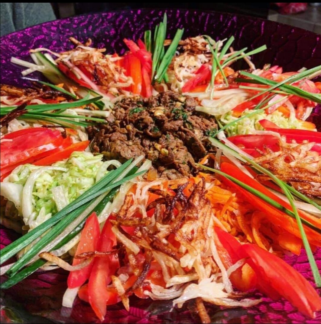 Среди всех представленных явст, мое внимание привлекла палитра цветов на большом блюде, я такого ещё не видела: аккуратные холмы вибрирующих краской овощей, разложенных по кругу, в центре горкой поджаренное мясо. Прямо при нас это все смешали.