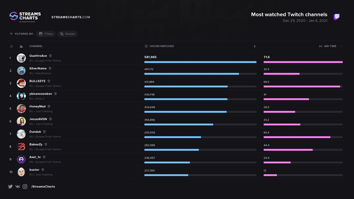 Escape from Tarkov захватывает топы Твича в первую неделю 2021-го года. Рейтинг распределился следующим образом:1. QuattroAce — 581 965 часов.2. SilverName — 491 172 часов.3. BULLSEYE — 431 884 часов.4. ybicanoooobov — 430 748 часов.5. HoneyMad — 426 646 часов.6. JesusAVGN — 356 856 часов.7. Dunduk — 293 939 часов.8. BakeeZy — 282 996 часов.9. buster — 227 360 часов.10. rasty_airsoft — 218 333 часов.