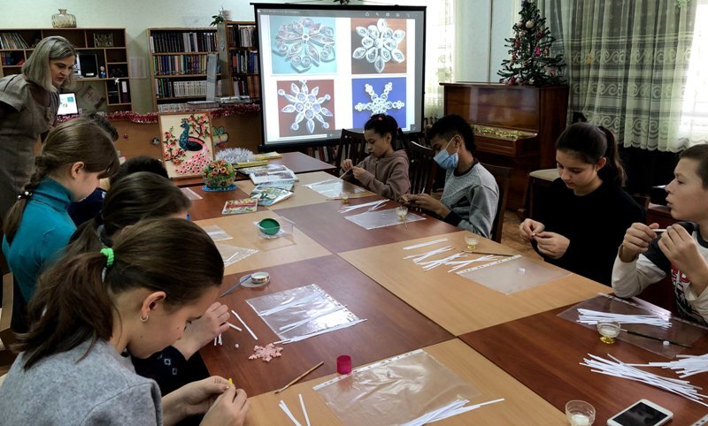 В отделе обслуживания учащихся среднего и старшего возраста, в период зимних каникул, прошёл мастер-класс для школьников по оформлению новогодней игрушки и снежинок в технике квиллинг, которая известна с ХV века. А к нам этот вид творчества пришёл из Европы в конце ХХ века.