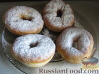 Продукты (на 8 порций)Мука - 5 стакановДрожжи сухие - 1 ст. л.Сахар - 1 ст. л.Соль - 1-1,5 ч. л.Растительное масло - 3 ст. л.Тёплая вода - 2 стаканаСахарная пудра - по вкусуРастительное масло для жарки - сколько уйдет