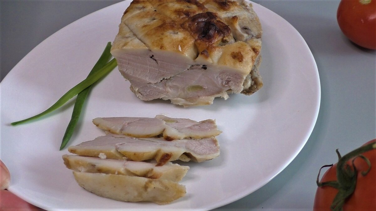 Сегодня у меня буженина, готовлю я ее по своему оригинальному рецепту. Получается она всегда очень вкусная и сочная. Отличная замена магазинной колбасе. Если вам понравится рецепт - поделитесь им в соцсетях, не забудьте подписаться на мой канал, если вы еще этого не сделали. Для тех, кто любит кино, видео-рецепт ниже. + БОНУСНОЕ ВИДЕО. ДАВАЙТЕ ГОТОВИТЬ. Я взяла вот такой кусок свиного окорока весом один килограмм. Можно взять лопаточную часть. Желательно, чтобы кусок был сверху с жирком, как у меня. Беру нож и делаю на сальной части надрезы в виде ромбов. Затем в каждом ромбике ножом делаю небольшие отверстия и вставляю сюда бутончики гвоздики. Мясо пока уберу. Подготовлю для него тузлук. В посуду для маринования кладу столовую ложку с горкой соли, смесь перцев, оставшуюся гвоздику, можно добавить любую приправу какую любите, наливаю холодную воду, примерно один литр, нам нужно чтобы мясо полностью было покрыто водой. Перемешиваю, чтобы соль растворилась. Кладу сюда подготовленный