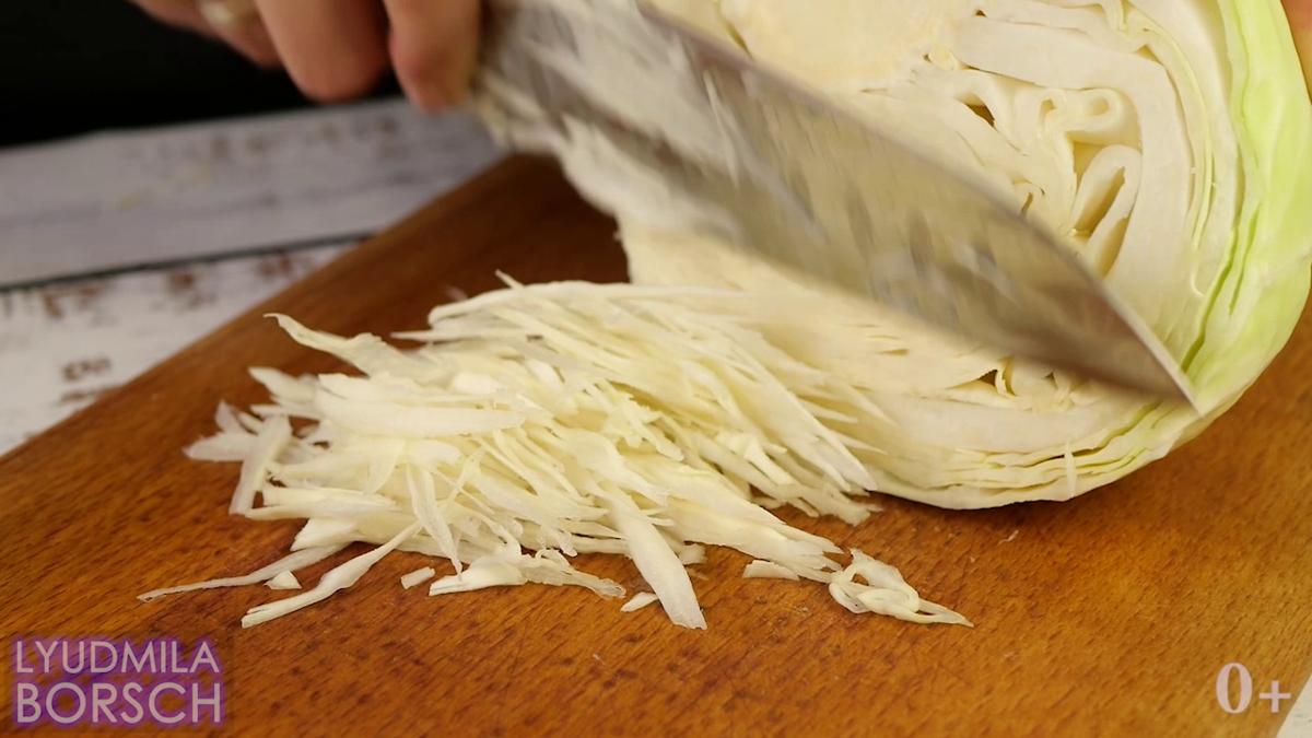 Для первого салата, как и для остальных, начнем с того, что нашинкуем капусту
