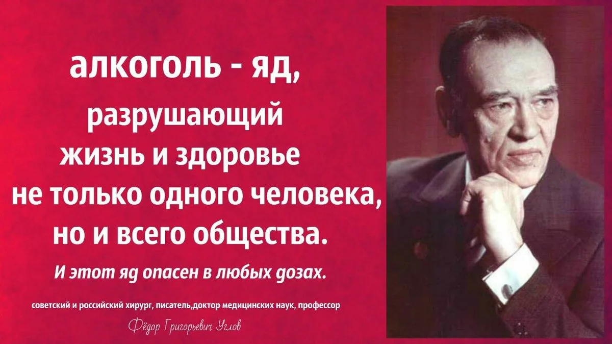 На фото, прикреплённом к статье, цитата Фёдора Григорьевича Углова, занесённого в «Книгу рекордов Гиннеса» как старейшего в истории мировой медицины практикующего хирурга – он оперировал и в возрасте свыше 100 лет, академик Российской академии медицинских наук, бессменный председатель «Союза борьбы за народную трезвость».