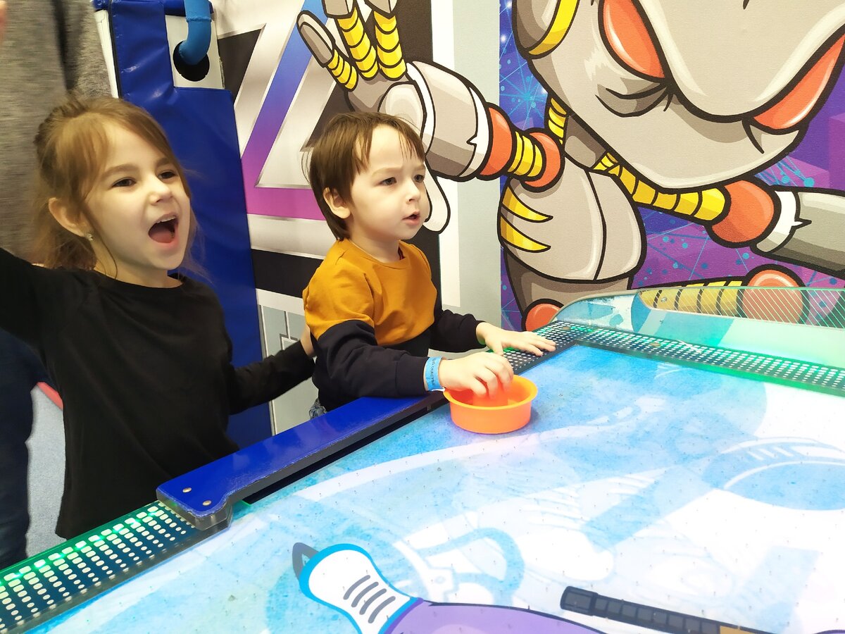 Демид был очень осторожен, он вообще очень осторожен во всем для него новом, но потом ему так сильно понравилось играть в аэрохоккей, что он обыграл девочку, которая старшего его на года два.