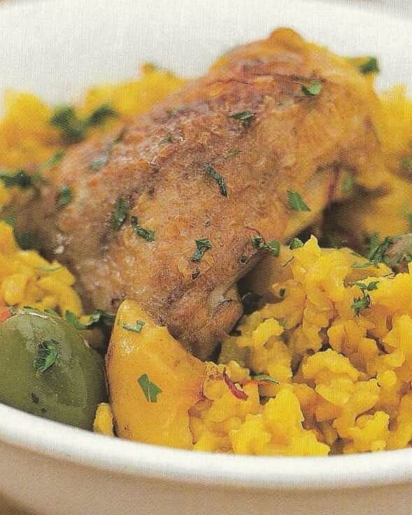 - Затем добавьте бульон и шафран в кастрюлю и разогрейте на слабом огне. Переложите курицу и лук в большую форму для запекания, добавьте желтый перец, лимоны и рис, затем полейте бульоном. Хорошо перемешать и приправить перцем. Накройте крышкой и готовьте в предварительно разогретой духовке при температуре 170-180 градусов в течение 45-50 минут или до тех пор, пока курица не станет готовой и мягкой.