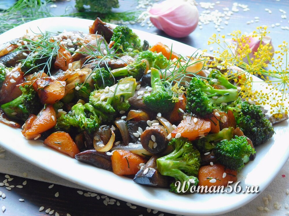 Рецепт вкусного блюда из капусты брокколи с грибами. Брокколи можно использовать как свежую, так и замороженную, причем размораживать ее не обязательно, просто чуть подольше подержать на сковороде. Здесь важно нарезать все продукты не слишком мелко, чтобы овощи остались хрустящими, и не передержать. Блюдо может быть подано и как самостоятельное, и в дополнение к гарниру из риса, макарон,