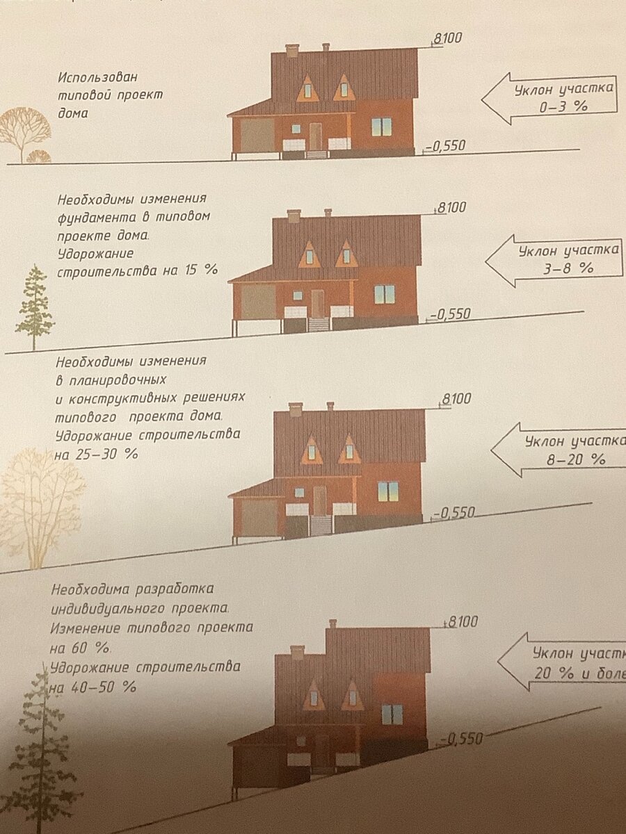 Но если не получилось стать обладателем ровного земельного участка, ни чего страшного, можно построить загородный дом и на земельном участке с уклоном, правда возникнут дополнительные трудности в проектировании и строительстве загородного дома, возрастают финансовые затраты на возведение фундамента, цокольного этажа. Склоны, обращённые на юг, получают больше солнечного тепла, в холодном климате позволит экономить электроэнергию. Отрицательные последствия земельного участка это расположение на крутом северном склоне, причиной тому могут быть сезонные подтопления и высокий уровень грунтовых вод, плохое состояние дорог и подъездных путей, недоступностью инфраструктур.