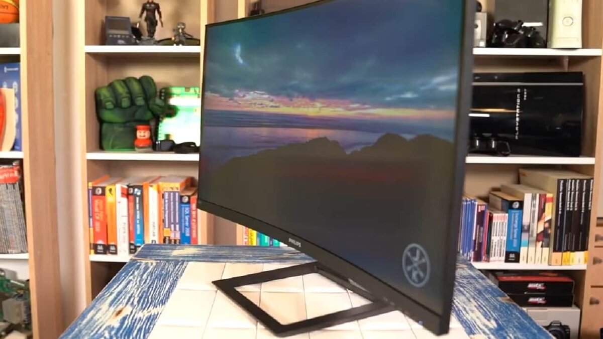 Тонкий корпус в сочетании с серой подставкой и чёрной ножкой выглядит эстетично, но при этом строго. Никаких изысков в бюджетной модели за 300 $ ждать не приходится, однако в интерьер девайс вписался отлично. Тестировал его не только с сигналом, передаваемым с персонального компьютера, но и после подключения к PS4 Pro.