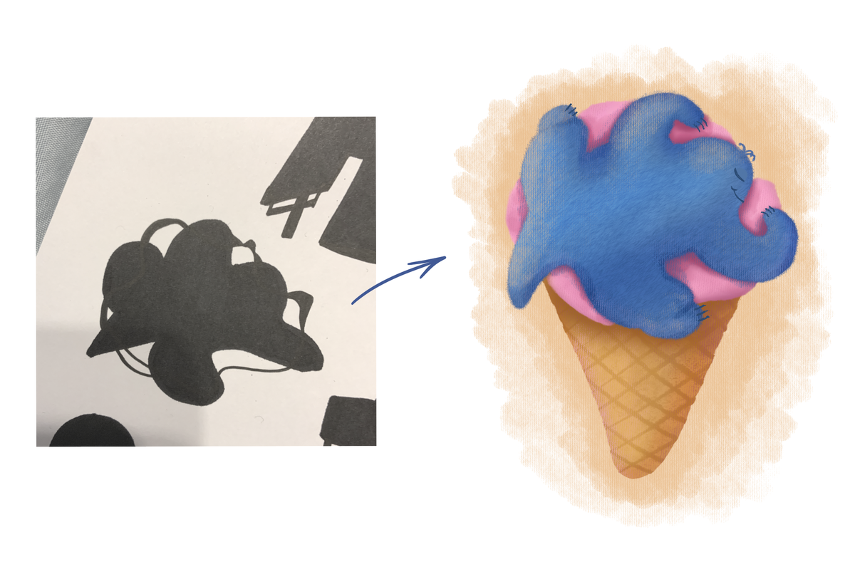 Берёшь лист бумаги/холст в программе и рисуешь выразительное пятно. Затем, начинаешь его разглядывать и представлять, что бы это могло быть. Можно крутить его, чтоб найти более интересную композицию.