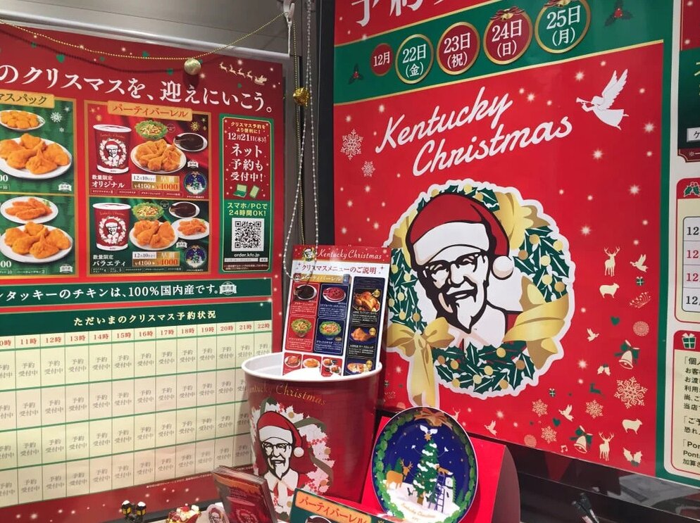 Еда из Kentucky Fried Chicken (KFC) может не быть вашим представлением о изысканном рождественском ужине. Но в Японии ведро всемирно известного жареного цыпленка гиганта быстрого питания-любимая праздничная традиция. Ритуал, начавшийся в 1974 году с блестящей маркетинговой кампании Kurisumasu ni wa kentakkii! - Кентукки на Рождество! - сейчас рестораны KFC ежегодно посещают около 3,6 миллиона японцев. Многие люди заранее заказывают ведерко за 3 336 иен (40 долларов), которое включает торт и шампанское, за несколько недель, чтобы избежать двухчасового ожидания. Йонас Рокка адъюнкт-профессор маркетинга бизнес-школы Emlyon во Франции считает, что необычный выбор продуктов питания помог заполнить пустоту в стране, которая только начала отмечать этот праздник несколько десятилетий назад. Он говорит: "в Японии не было традиции Рождества, и поэтому KFC пришла и сказала: Вот что вы должны делать на Рождество.”