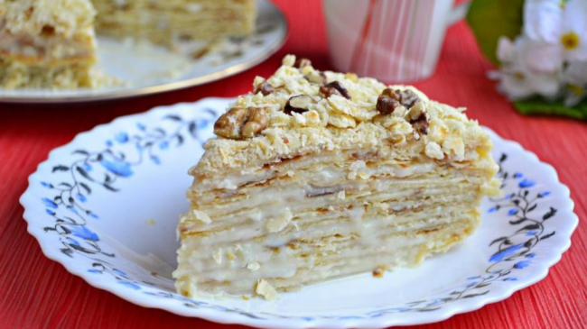 Это мой любимый домашний десерт. Он получается белоснежным, праздничным и очень вкусным. Он не содержит много жира и не очень сладкий. У него утончённый и нежный вкус. Торт абсолютно не похож на классический слоеный Наполеон, испечённый в духовке. Алгоритм приготовления лакомства очень старый, им радовали гостей ещё наши бабушки. В состав теста входит сметана, а не маргарин. А крем будем использовать заварной. Приступим к приготовлению!
