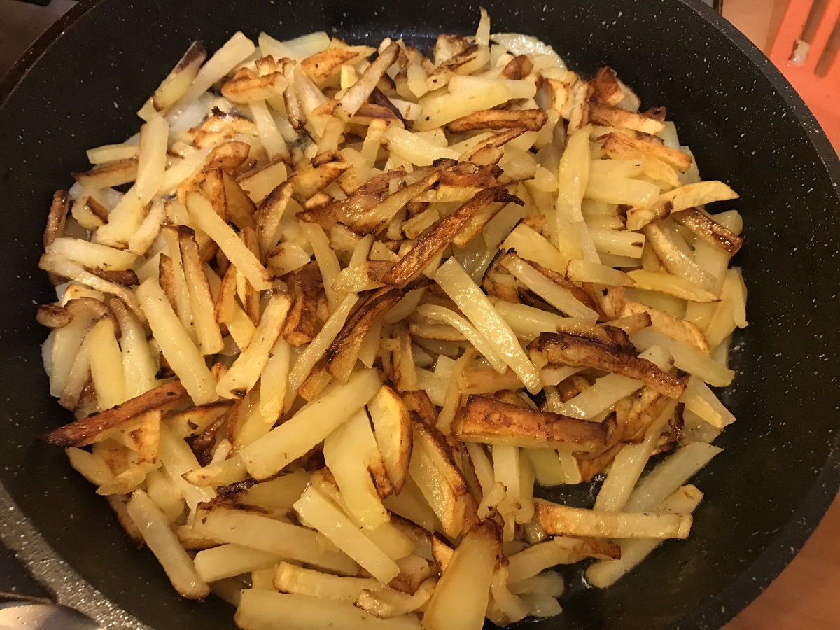 Не жалейте масла. Только на хорошо смазанной сковороде получится хорошо поджарить картошку.