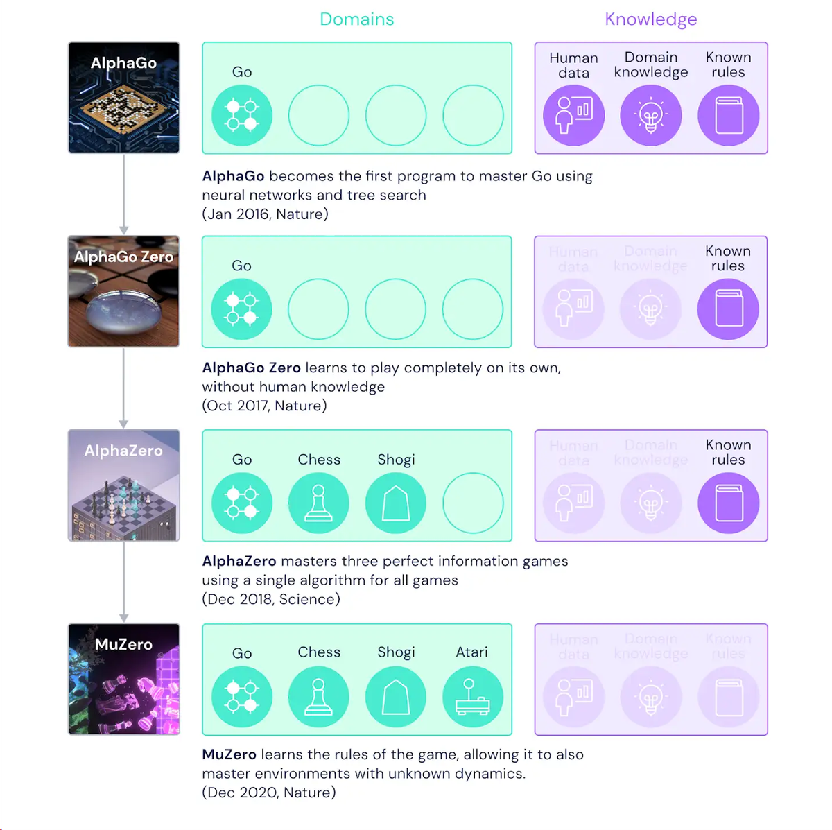 В 2016 году DeepMind представила AlphaGo, первую программу искусственного интеллекта (ИИ) способную одержать победу над человеком в древней игре го. Два года спустя его преемник, AlphaZero, научился с нуля овладевать го, шахматами и сёги (японские шахматы). И вот теперь появился MuZero, который самостоятельно осваивает го, шахматы, сёги и игры Atari благодаря своей способности планировать выигрышные стратегии в неизвестной среде.