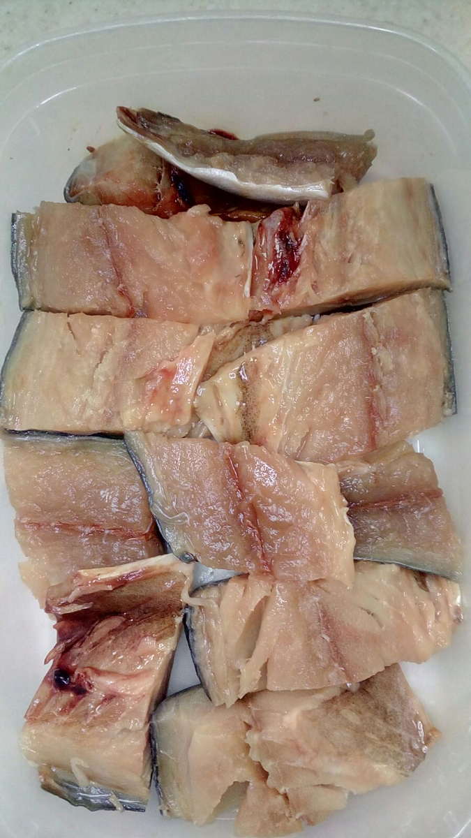 Берём замороженную скумбрию, хвост и голову кошке (если она у вас есть). Тушку на филе. Шкуру не отделяем! Разделывать рыбу лучше пока она чуть примороженная, так она не будет разваливаться и кусочки будут более красивые.