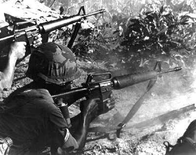 В ноябре 1965 года спецназ США вступил в жестокий и затяжной бой с подразделениями 1-й дивизии Северного Вьетнама. Командир американского отряда Гарольд Г. Мур о новой винтовке сказал следующее: «сегодня M16 принес нам победу». В то же время он отметил, что высокая эффективность автоматической стрельбы была достигнута на дистанции до 200 метров, а на расстоянии свыше 300 метров не всегда удавалось пробить стальной шлем противника. «M14 и 100 патронов весят столько же, как M16 и 250 патронов, - заявил Гарольд Г. Мур. - Это означает, что каждый боевой солдат и морской пехотинец может значительно дольше вести огонь».
