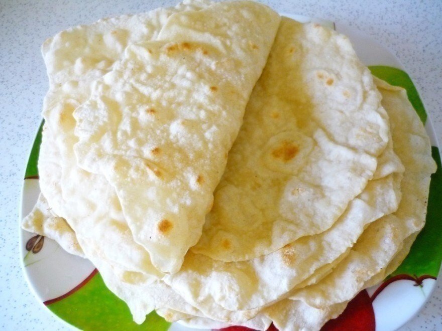 Замесить тесто, оно получается мягкое, приятное и эластичное. Разделить на 20-16 шариков, всё зависит от диаметра сковороды. Накрыть клеёнкой и дать отдохнуть тесту 20 минут. Раскатать тонкую лепешку и потом ещё растянуть в руках как можно тоньше, у меня они прозрачные почти. Обжарить на хорошо разогретой сковородке без жира по несколько секунд с каждой стороны. Снять на заранее приготовленную поверхность и хорошо побрызгать ещё горячее изделие водой, накрыть клеёнкой, и так поступать с каждой лепёшечкой (водой брызгать обязательно так как они будут сухие и не эластичные).