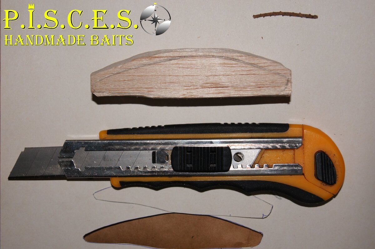 Во второй части мы будем грубо придавать очертание формы приманки ножом, и далее зашлифовывать наждачной бумагой нескольких видов зернистости, от грубой, до более мелкой. И так приступим. Отрезаем лишнее, у меня с верху, у вас может быть по другому, в зависимости, к какой стороне прямоугольной заготовки вы приложили трафарет.