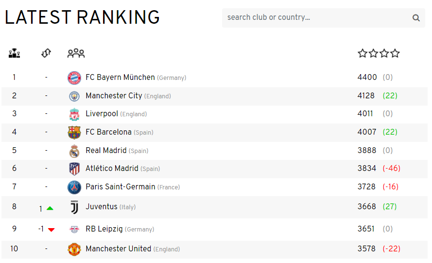 Наверное, вряд ли кто будет спорить с лидерством Баварии. Команда выиграла Лигу чемпионов, стала чемпионом Германии, да и сейчас лидирует в немецкой Бундеслиге, пусть и отрыв от Лейпцига составляет всего 2 очка. В общем первое место безоговорочно баварское. Далее же наблюдается какая-то интересная ахинея. Манчестер Сити на втором. По какой такой причине? Клуб ни разу за все время правления шейхов до финала Лиги чемпионов не дошел, всего раз играл в полуфинале главного еврокубкового турнира, да и в чемпионате Англии без шансов уступил Ливерпулю. При этом сейчас команда даже в лидирующую лигочемпионскую четверку не входит. За какие заслуги этот коллектив оказался на втором месте?