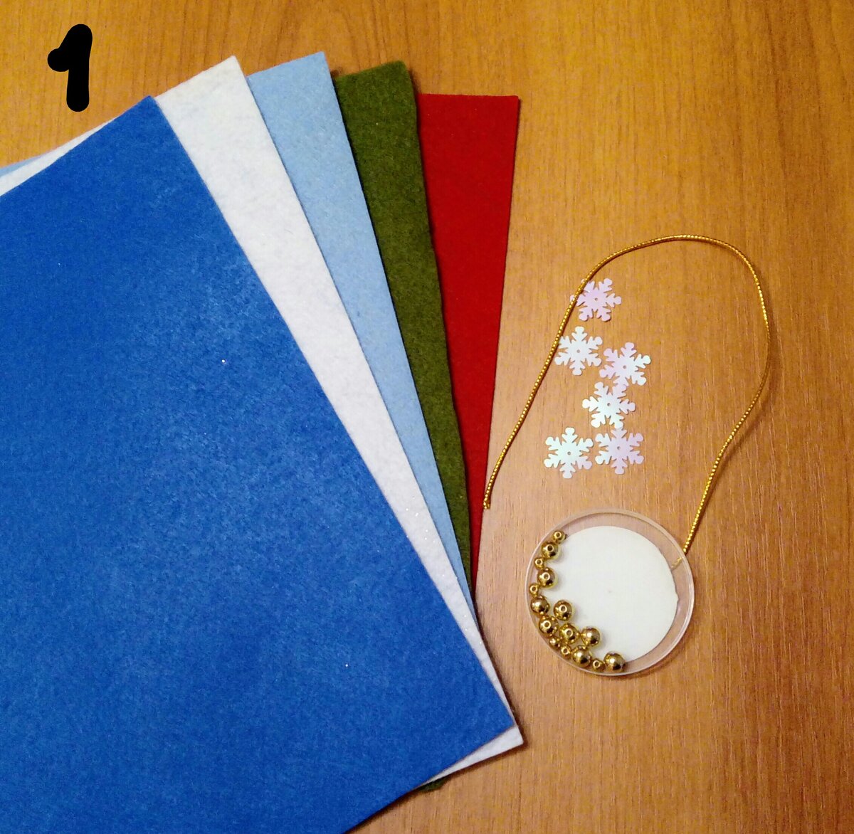 1. Для работы нам понадобятся: картон тонкий, фетр: белый, голубой, синий, красный, зеленый. Бусины золотистые, шнур тонкий золотистый, снежинки декоративные, клеевой пистолет.