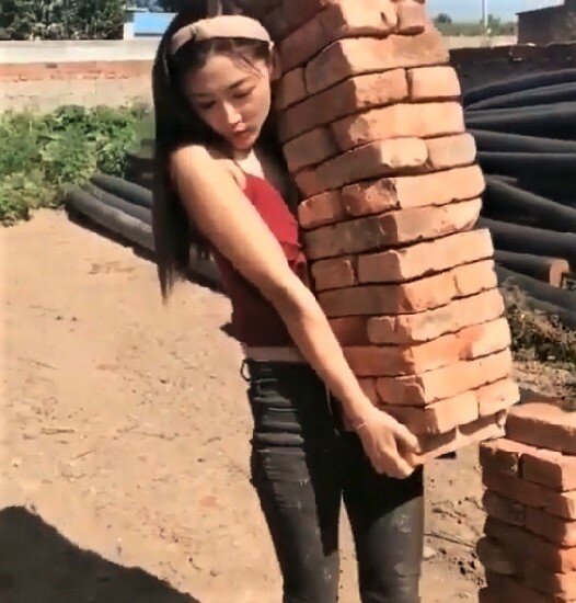 Слабый пол, он не всегда слабый. Не зря говорится: «Коня на скаку остановит, в горящую избу войдёт». Вот нет под руками тележки — ничего страшного, можно потихоньку и руками перетаскать. Эта девушка взяла, конечно, многовато, но, скорее всего, она уверена в своих силах.
