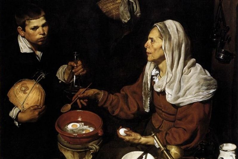 Первое, что начал писать Веласкес, – бодегоны. Бытовые сценки, которые разворачиваются в таверне или харчевне, в погребке или на кухне. Здесь весело распивают вино. Спорят. Побренькивают на гитаре. И снова сближают кружки. Здесь старая кухарка жарит яичницу, а молодая толчет в ступке специи и чеснок. Кто-то однажды заметил: в бодегонах для Веласкеса натюрморты важнее портретов. Люди у него – прекрасные, но как будто застывшие. А вот вещи, все эти глиняные кувшины, обливные чашки, латунные ступки, селёдки и луковицы – точно живые.