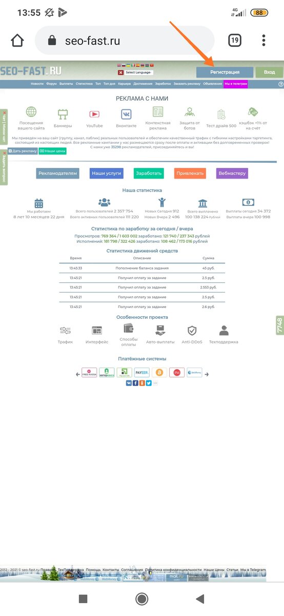 Seo-Fast - это сервис активной рекламы, где люди продвигают свои интернет-проекты, ресурсы и не только. Но, а мы как раз на этом и будем зарабатывать. Для этого переходим на сайт и регистрируемся.