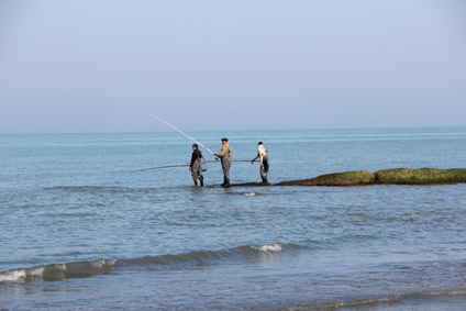 В некоторых местах рыбаки на сваях сооружают хижину и ловят с неё. В этот раз мы ловили рыбу стоя по пояс в воде. В Азербайджане можно простоять в море все лето и ничего не отморозить.