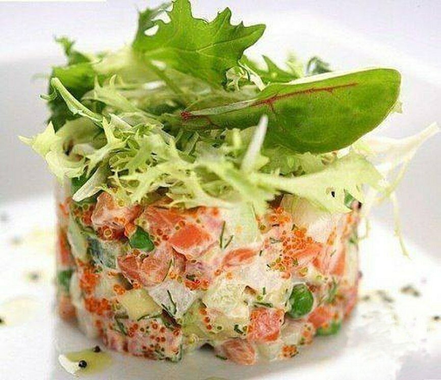 7️⃣. Посолить и поперчить. Смешать 150 гр сметаны с икрой и заправить полученным соусом салат. Украсить зеленью.