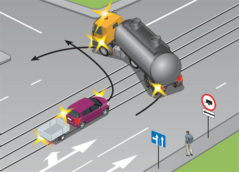 Легковушка начала поворот слишком рано. Водитель, что называется, срезал угол. Так разве можно? А можно ли ехать под такой знак с прицепом?