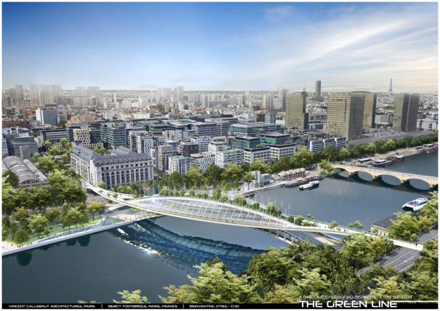 Компания Vincent Callebaut Architectures представила фантастический проект «Зеленой линии», футуристического пешеходного моста в Париже, который будет работать на возобновляемых источниках энергии, перерабатывать собственные отходы и бороться с загрязнением городского воздуха, производя при этом 87 500 кг свежих фруктов и овощей каждый год. Это амбициозное предложение было создано для участия в международном конкурсе дизайна Reinventing Cities - C40, организованном Ceetrus. Проект «Зеленая линия» охватывает реку Сена между 12-м и 13-м округами Парижа.