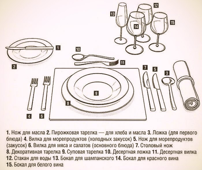 Суповую ложку кладут справа от тарелки, дальше всего; затем, ближе к тарелке, нож для рыбы или другой закуски, еще ближе — нож для следующего блюда, и у самой тарелки — нож для главного блюда. Ножи кладутся отточенной стороной лезвия в сторону тарелки.