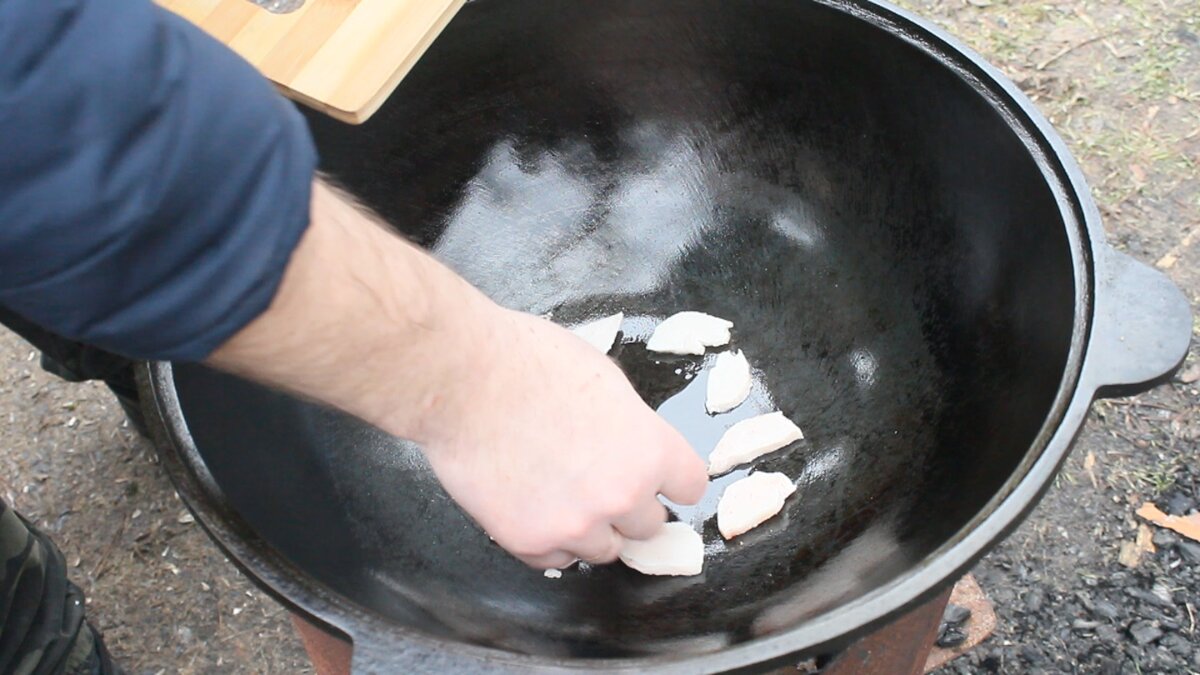 В холодный казан на дно выкладываю нарезанные кусочки курдюка.
