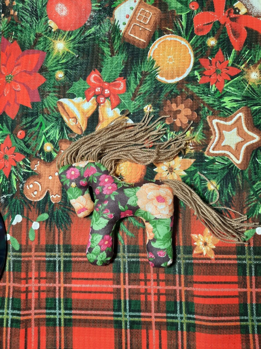 Делаем гриву и хвост из шерстяной нитки и вставляем между тканью