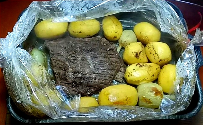 Это один из самых простых и незатейливых рецептов, не требующий много времени на приготовление. Здесь мы будем запекать говядину сразу с гарниром, а точнее — с картошкой. Делается все очень быстро и легко.