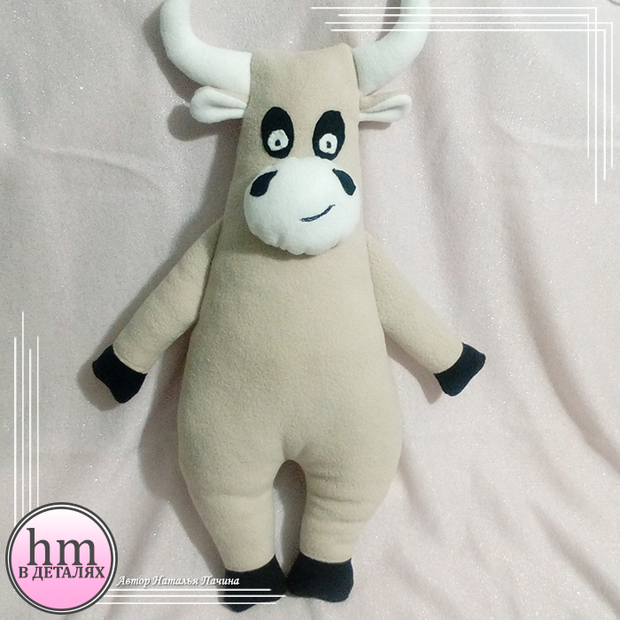 Сшила символ года. У меня это бычок. Выкройку делала сама. Весь процесс пошива смотрите в фото. Подумываю сшить ему подружку коровку. Если сошью, обязательно выложу фото