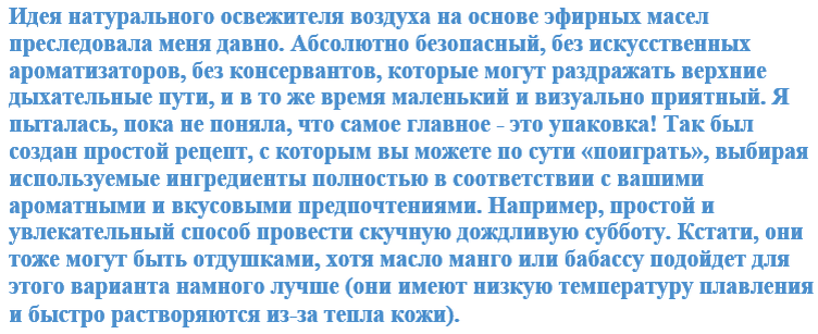 - около 50 капель эфирных масел (перед добавлением эфирных масел в основу лучше всего их смешивать друг с другом)