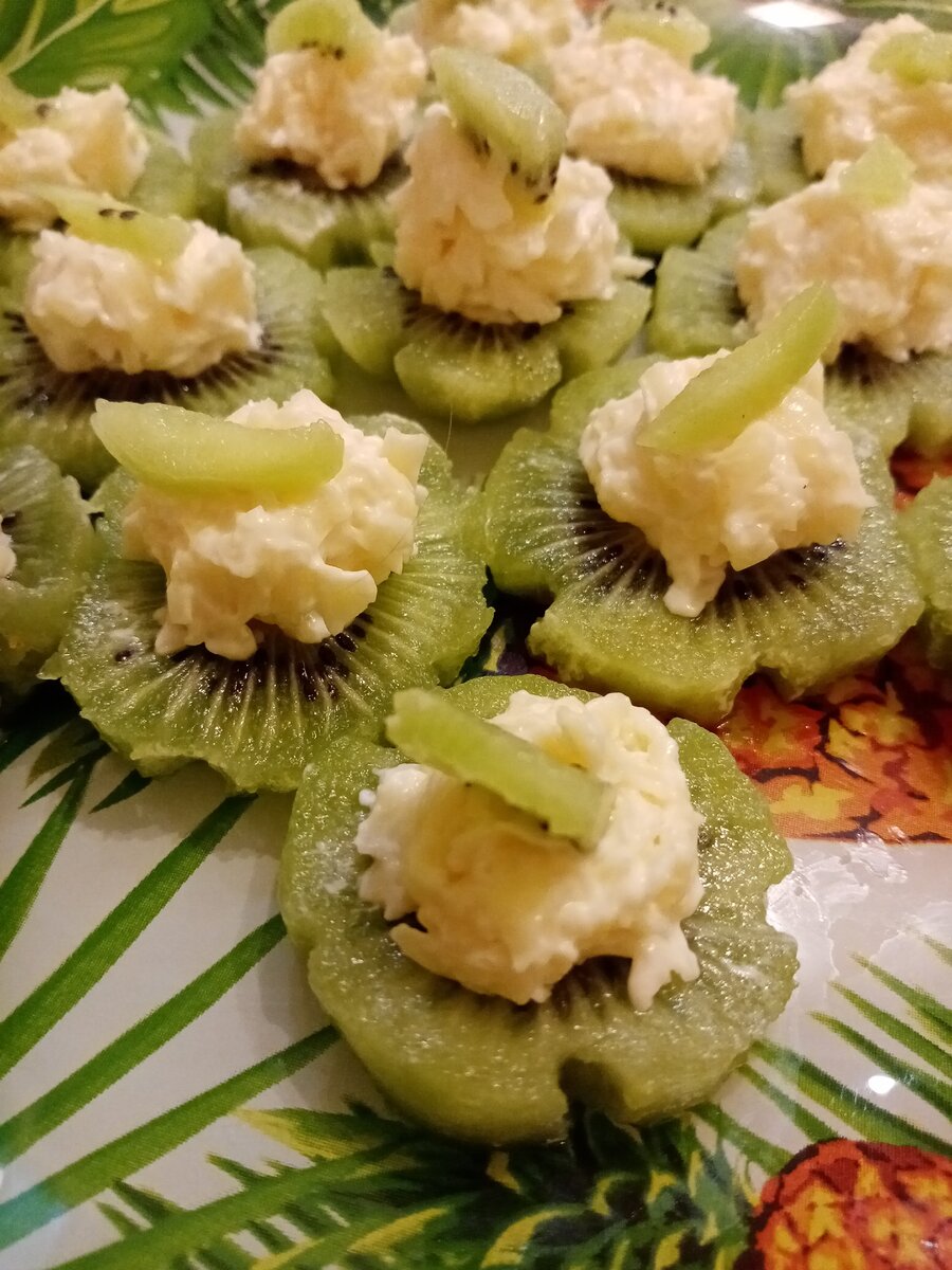 Кисло-сладкий свежий вкус киви прекрасно сочетается с пикатной сырной начинкой. Исчезает закуска с праздничного стола в миг. Сначала завлекает красивым внешним видом, а потом покоряет и вкусом. Закуска