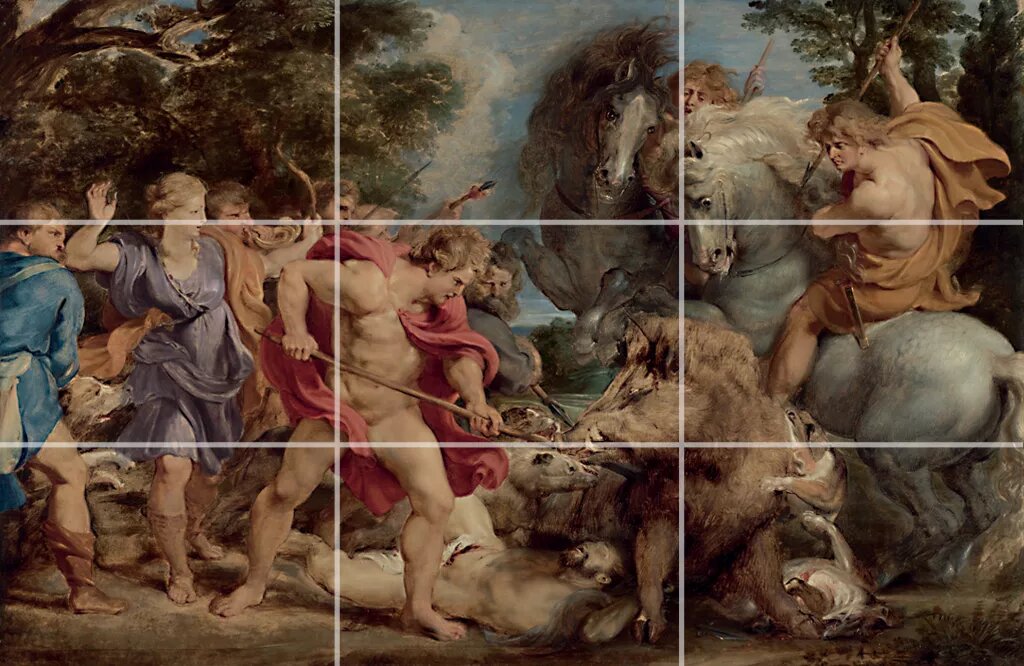 Eyeflow( падение взгляда)- еще одно отличное применение правила третей. На этой картине Рубенса главный фокус кабана помещен на перекрестке. Второстепенные точки интереса также падают на пересечениях, и действие поз уводит взгляд от одной точки фокусировки или пересечения к другой.